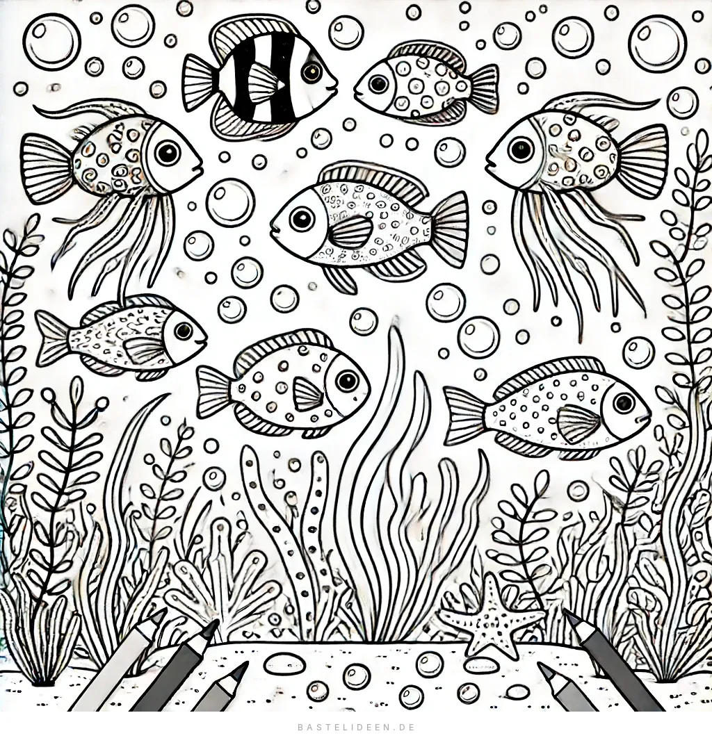 Dieses bezaubernde Ausmalbild zeigt eine dynamische Unterwasserszene mit verschiedenen Fischen, die zwischen Seegras, Korallen und Blasen schwimmen.