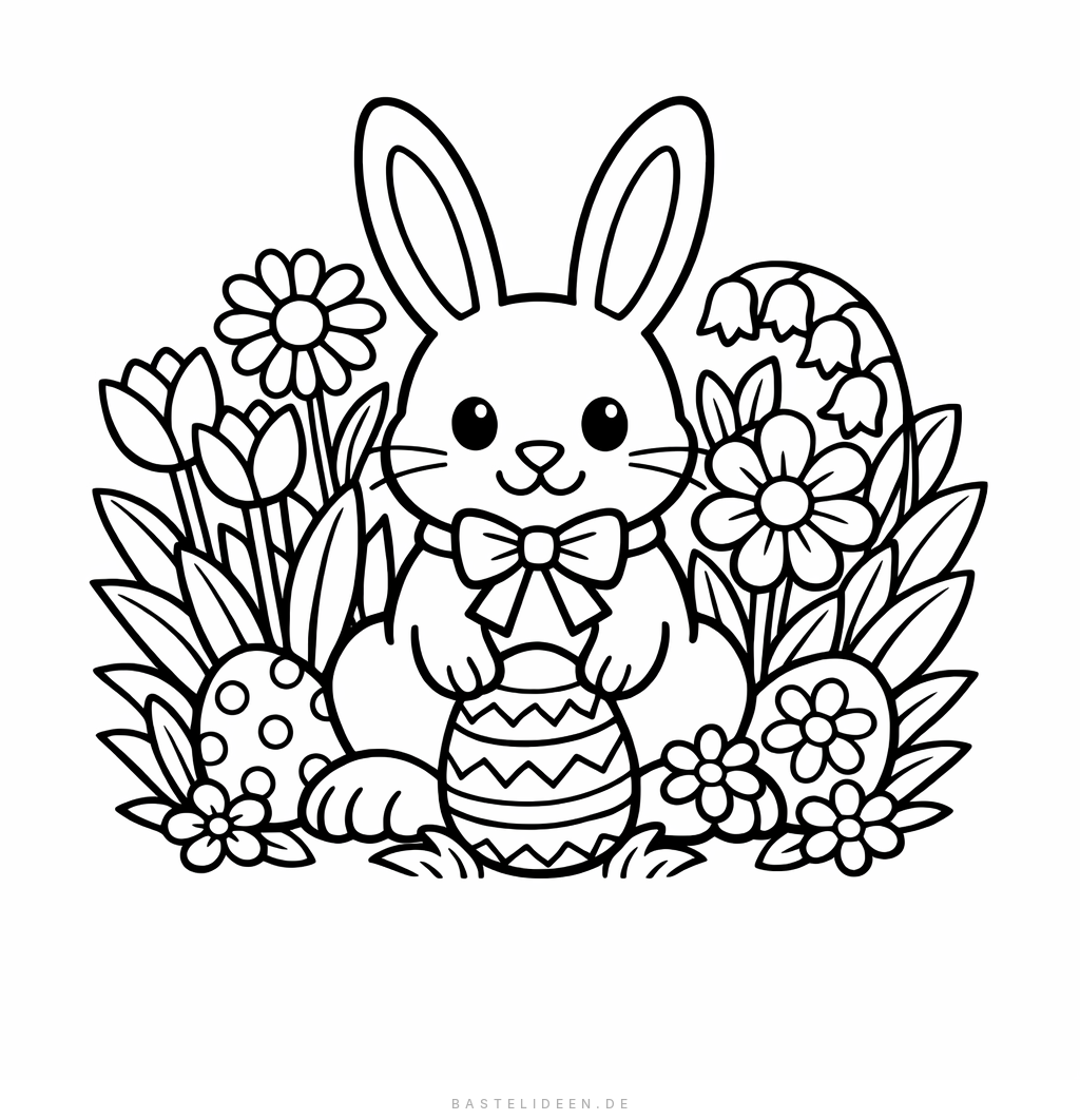 Süßes Osterhasen-Ausmalbild mit Frühlingsblumen für Kinder ab 6 Jahren.