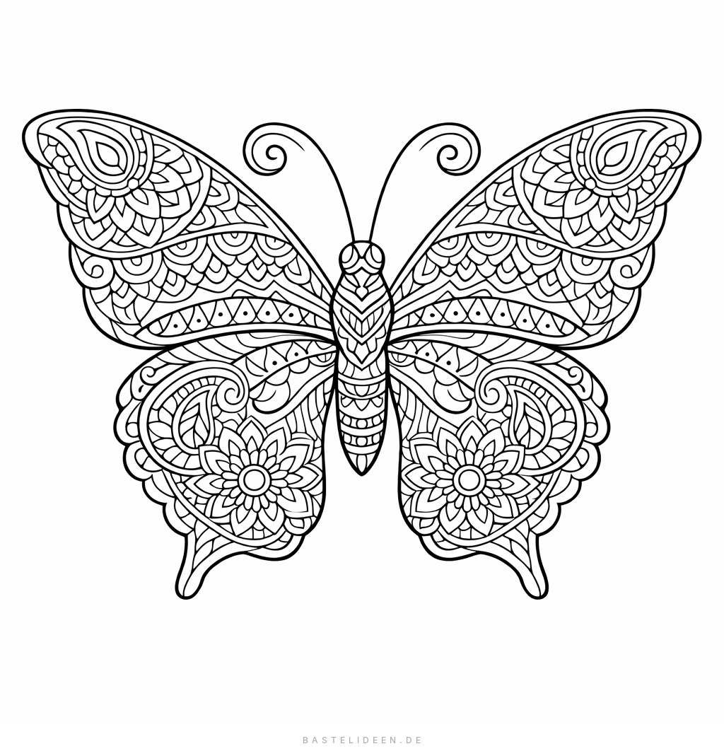 Meditatives Schmetterling-Ausmalbild mit kunstvollen Mustern für Erwachsene.