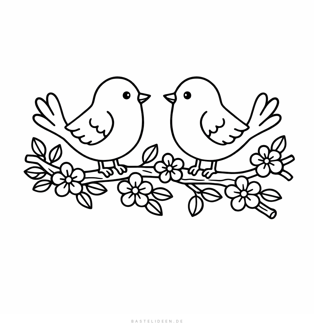 Frühlingshafte Vögel auf einem Ast mit Blüten, perfekt für Grundschulkinder.