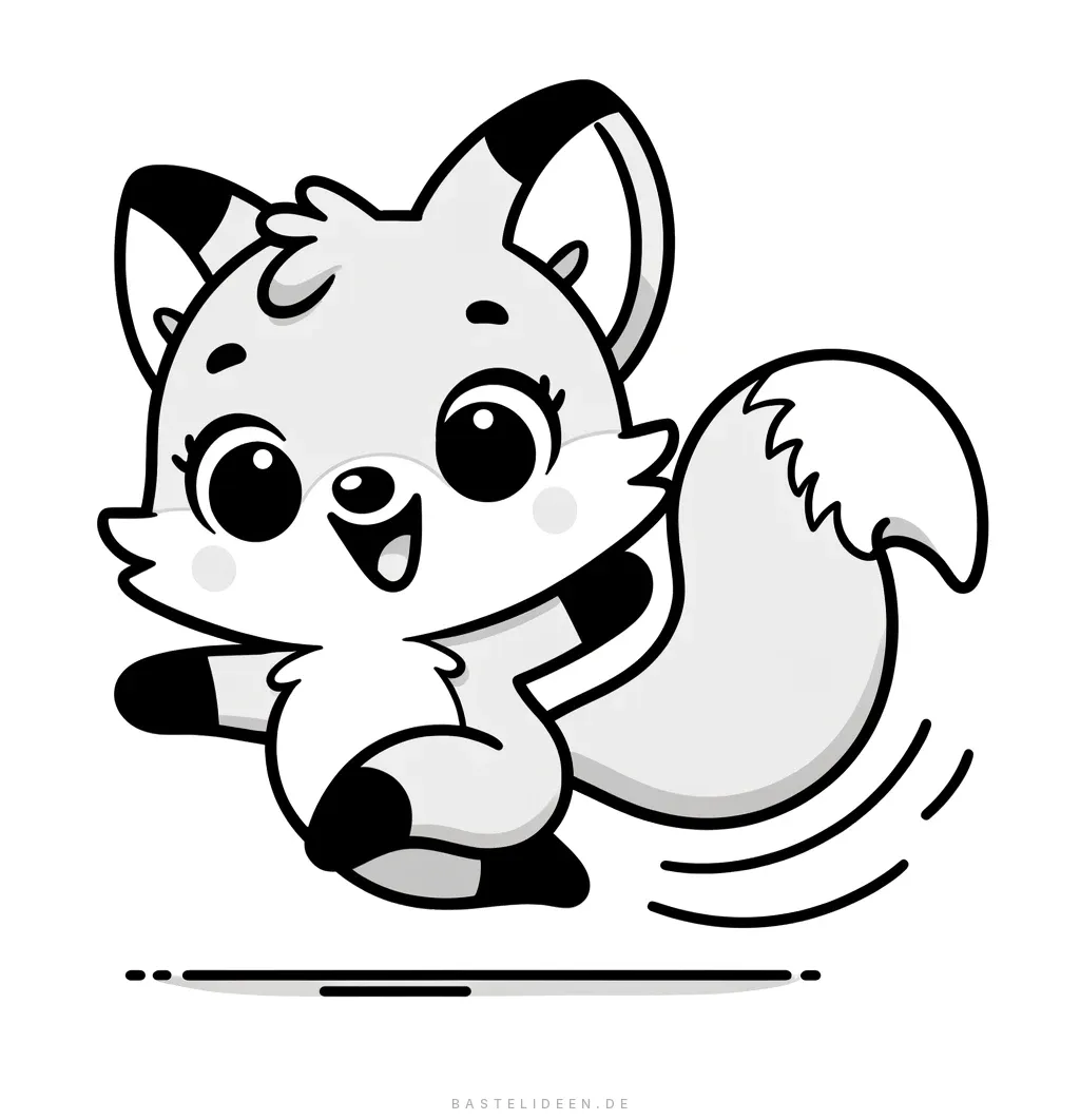 Lebhaftes Ausmalbild eines verspielten Fuchses, der fröhlich springt und seinen Schwanz wedelt.