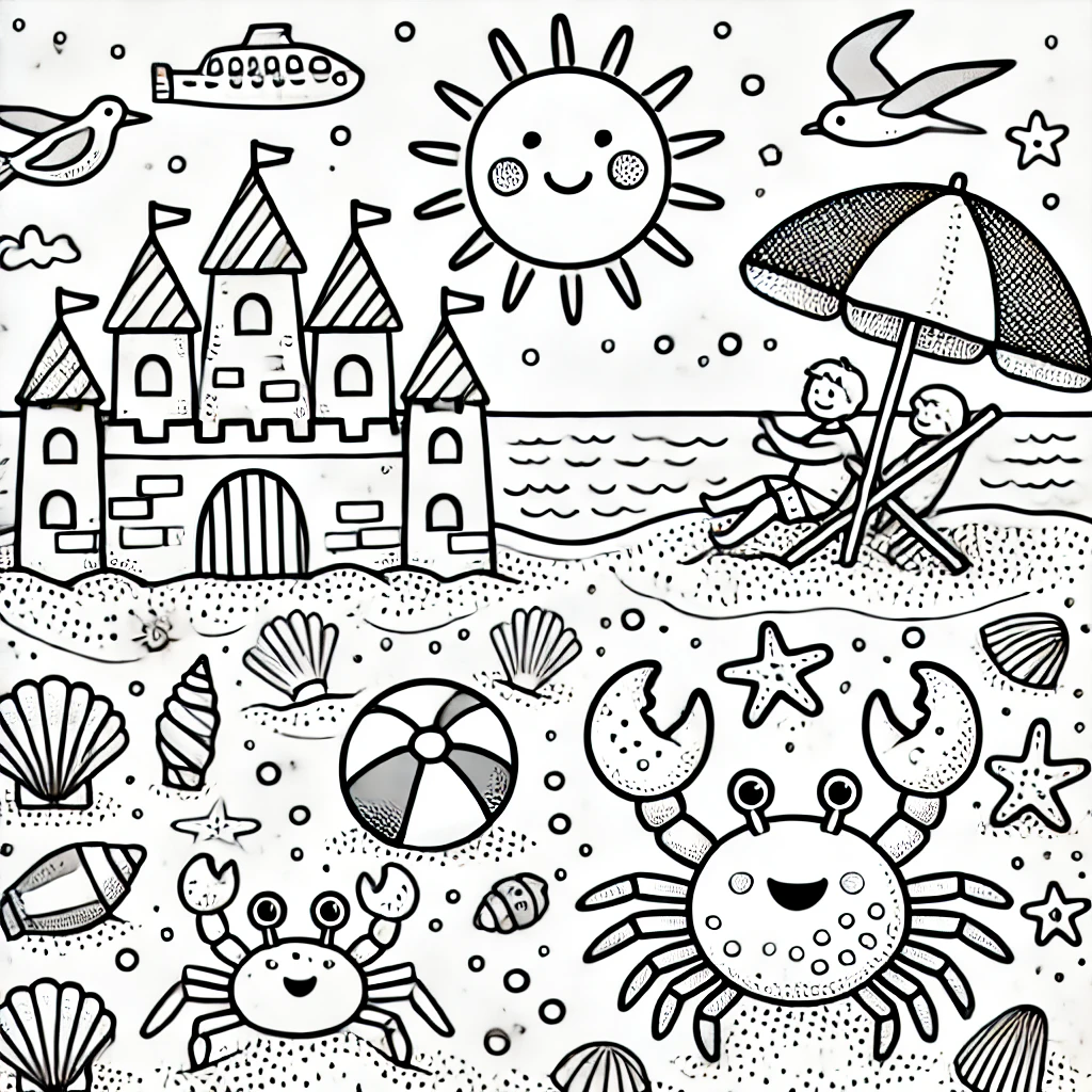 Dieses bezaubernde Ausmalbild fängt den perfekten Strandtag ein, komplett mit einer lächelnden Sonne, einer prächtigen Sandburg, Muscheln und einem freundlichen Krebs.