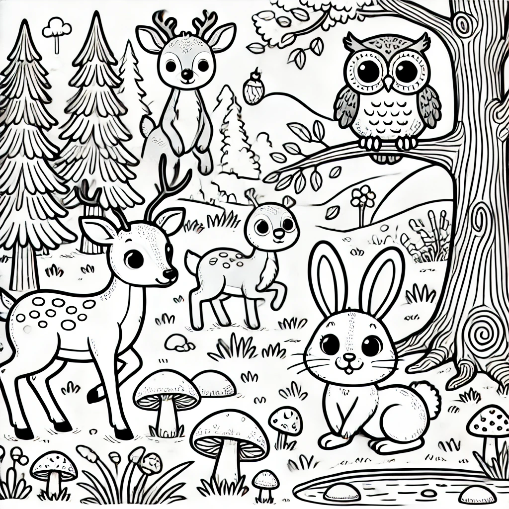 Dieses bezaubernde Ausmalbild zeigt eine Gruppe niedlicher Waldtiere, die einen friedlichen Tag in der Natur genießen. Mit verspielten Rehen, einer weisen Eule und einem süßen Hasen.