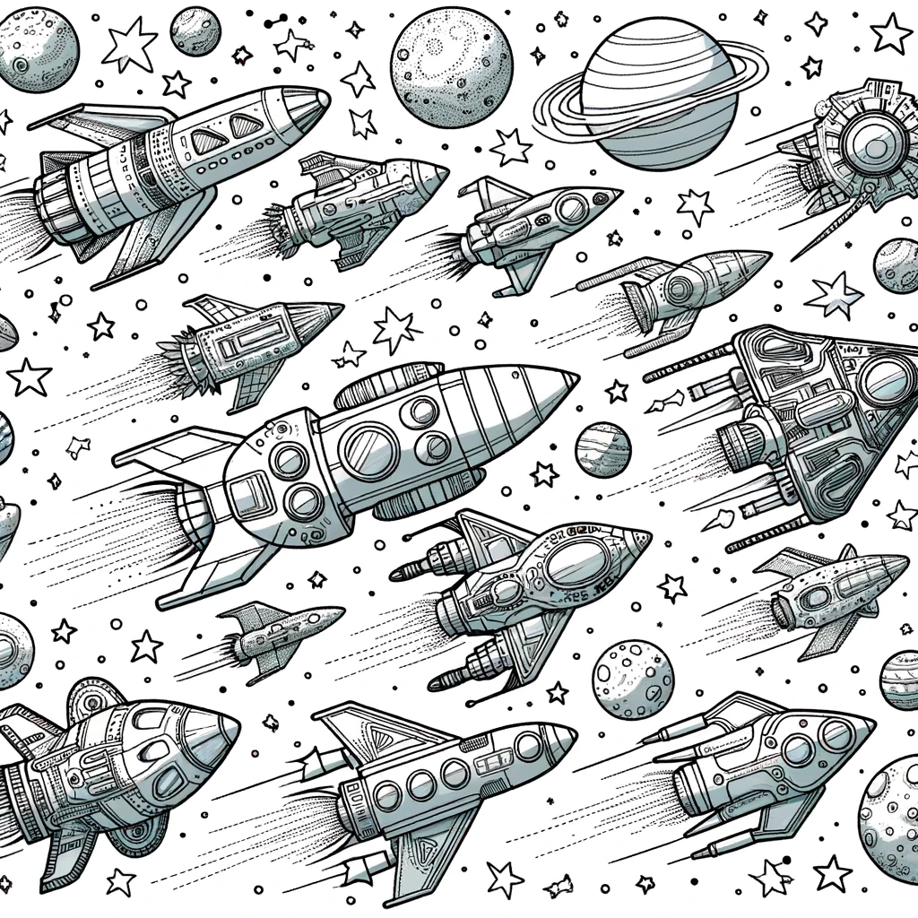 Starte in ein Ausmal-Abenteuer mit dieser Ausmalseite, die eine Vielzahl von Raumschiffen zeigt, die durch eine sternenübersäte Galaxie sausen. Perfekt für junge Weltraumbegeisterte.