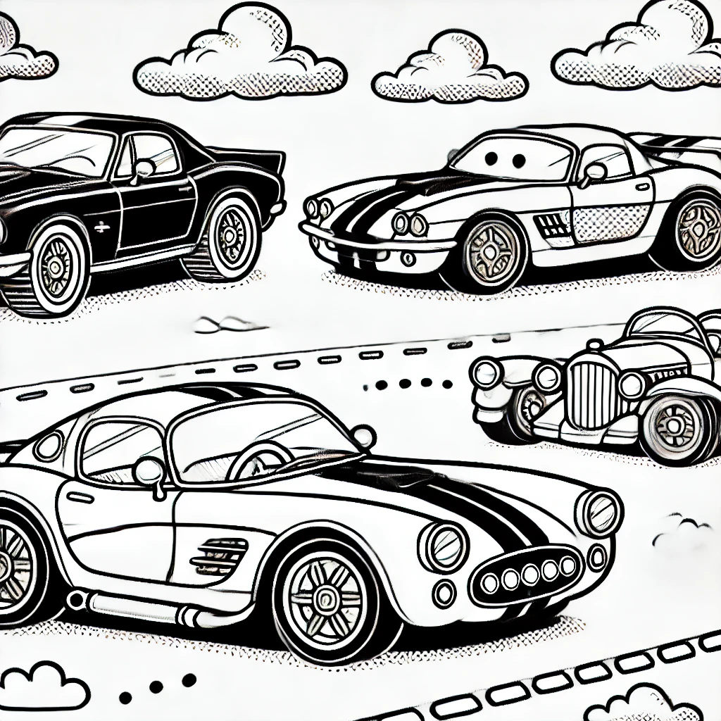 Das Bild zeigt eine aufregende Sammlung klassischer und Sportwagen, die alle mit kräftigen Linien gezeichnet wurden. Die Autos rasen auf einer kurvigen Straße unter einem Himmel mit flauschigen Wolken.