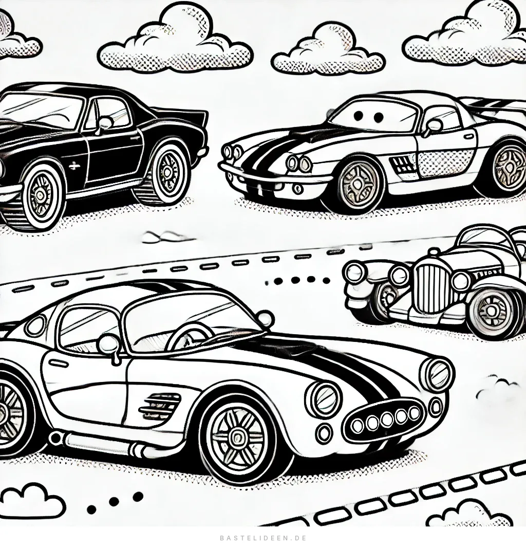Das Bild zeigt eine aufregende Sammlung klassischer und Sportwagen, die alle mit kräftigen Linien gezeichnet wurden. Die Autos rasen auf einer kurvigen Straße unter einem Himmel mit flauschigen Wolken.