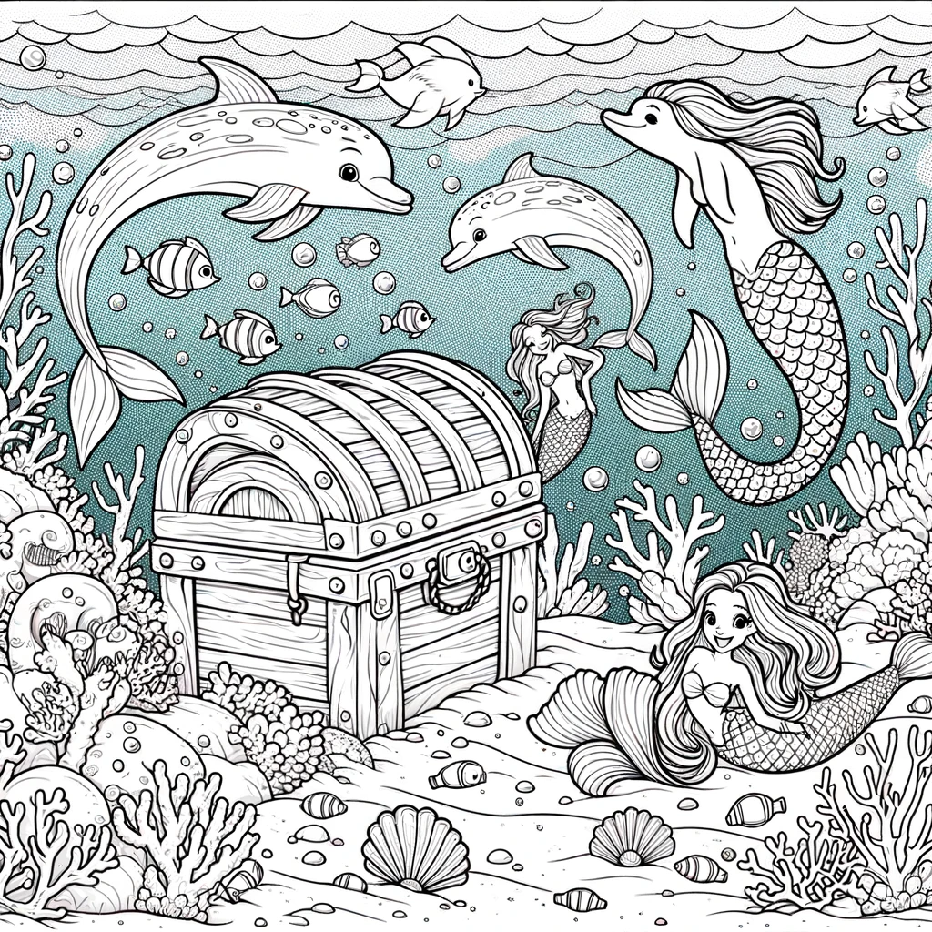 Stürze dich in ein Unterwasserabenteuer mit diesem Ausmalbild. Diese bezaubernde Meereslandschaft zeigt verspielte Delfine, freundliche Fische und anmutige Meerjungfrauen.