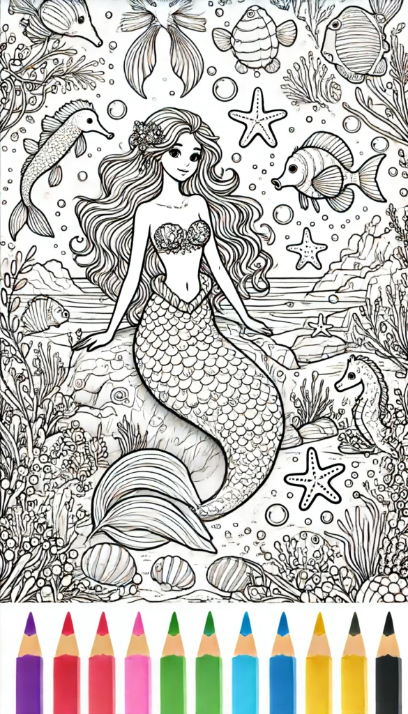 Dieses fesselnde Ausmalbild zeigt eine bezaubernde Meerjungfrau, umgeben von einer Unterwasserwelt voller Fische, Seepferdchen, Seesterne und Korallenriffe. Die filigranen Details schaffen eine magische Szene.