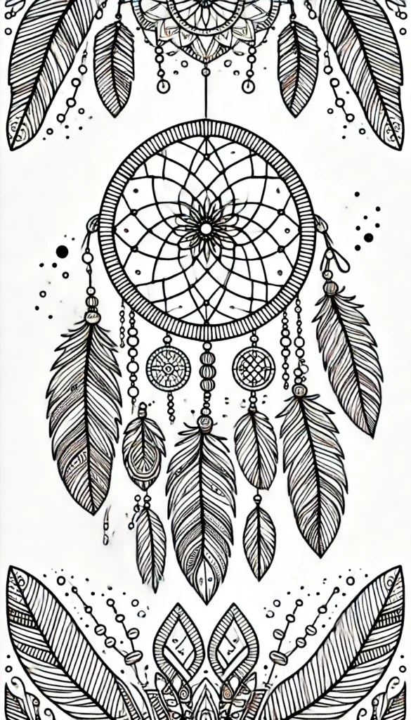 Dieses wunderschön detaillierte Ausmalbild zeigt einen kunstvollen Traumfänger, der mit zarten Federn, Perlen und ornamentalen Mustern verziert ist. Das aufwendige Design bietet ein entspannendes Ausmalerlebnis.