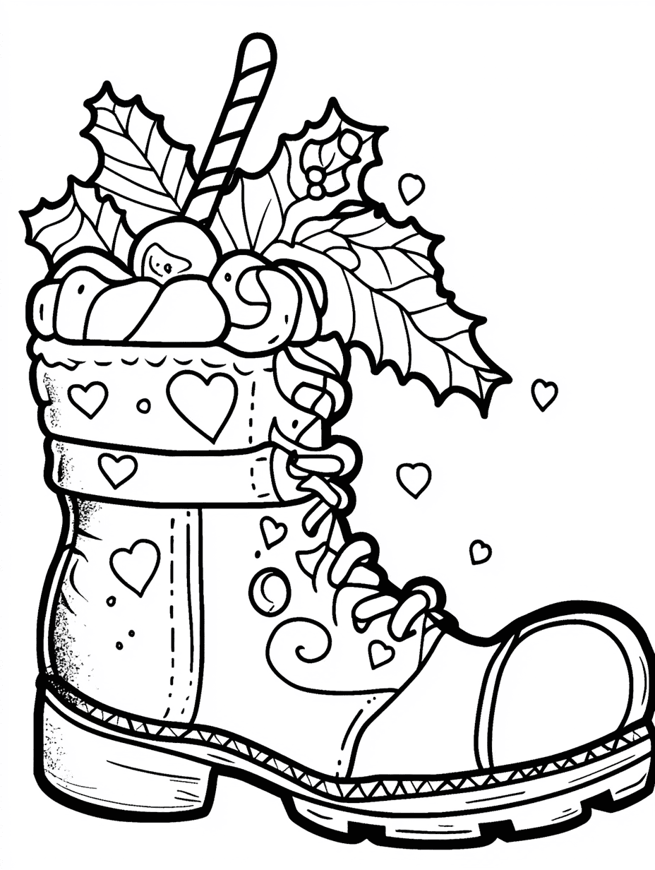 Dieses fröhliche Weihnachtsstiefel-Bild ist perfekt für kreative Kinder! Mit Herzen, Zuckerstange und Stechpalme lädt es dazu ein, in bunten Farben ausgemalt zu werden.