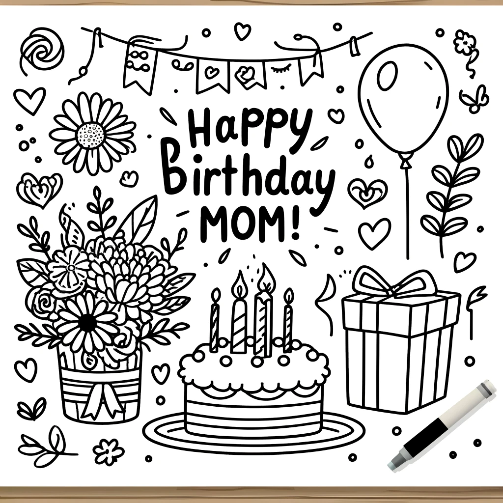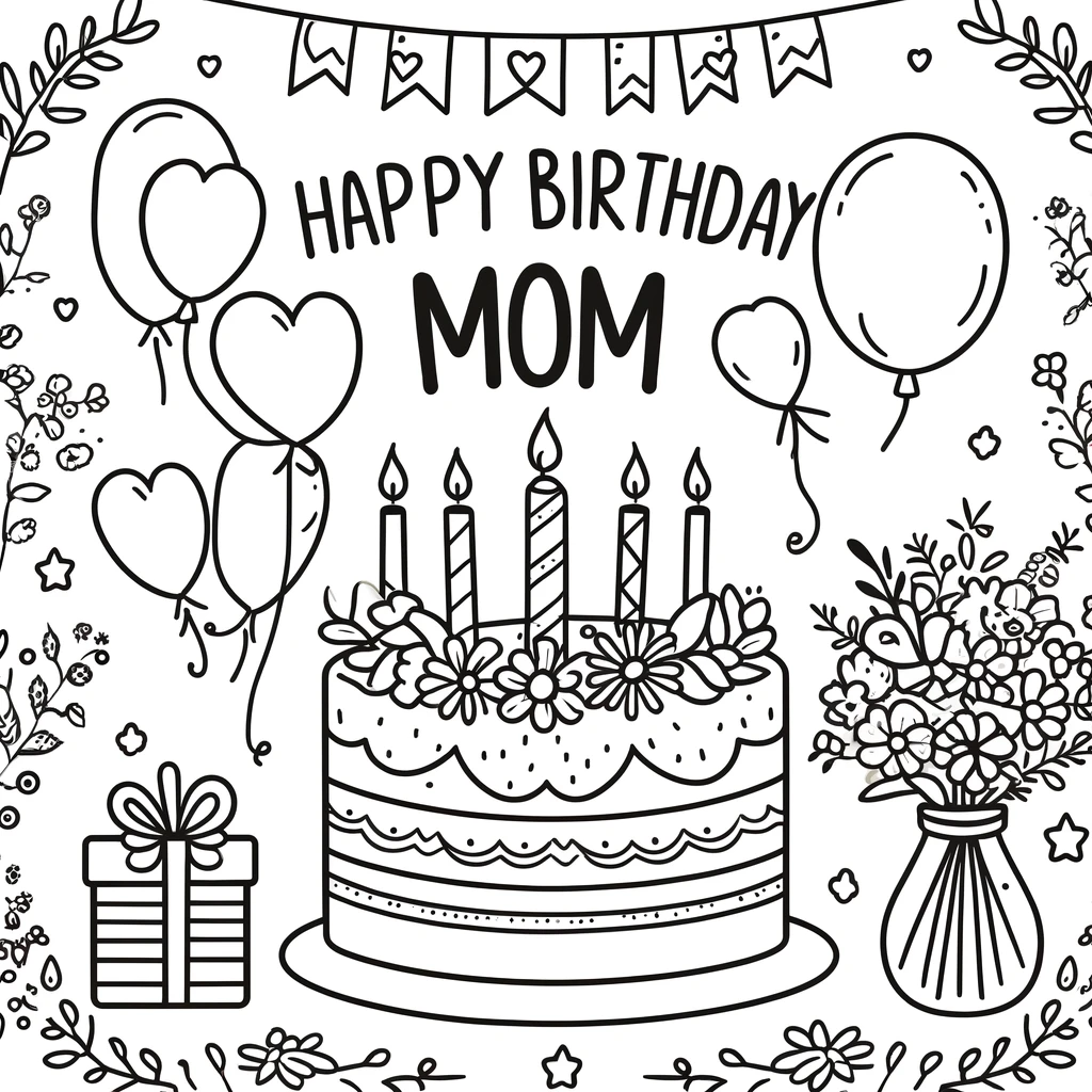 Perfekt für Kinder und Erwachsene, umfassen diese Illustrationen wunderschöne Geburtstagskuchen, liebevolle Botschaften und niedliche Dekorationen. Lade die Bilder herunter, drucke sie aus und male diese charmanten Seiten, um ein persönliches und durchdachtes Geschenk zum Geburtstag deiner Mama zu gestalten.