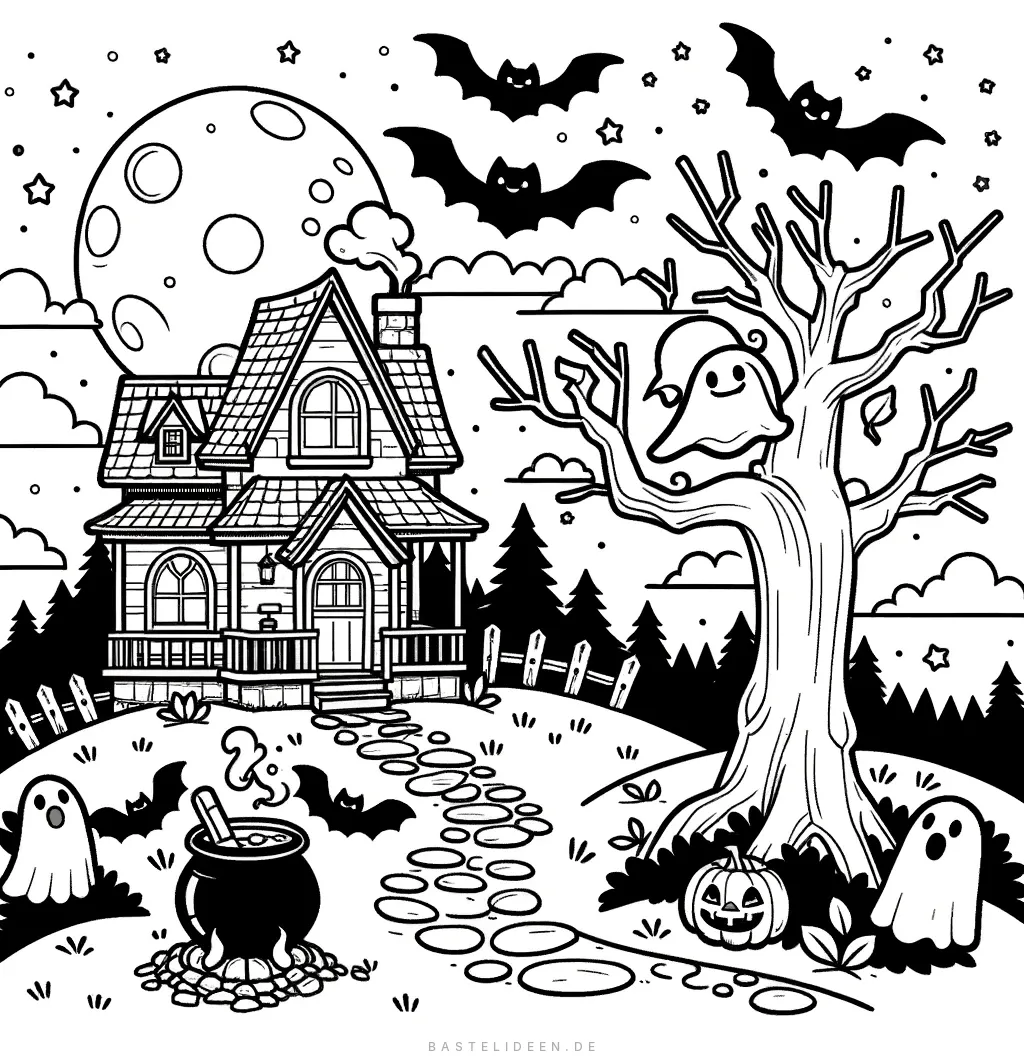 Mach dich bereit für gruseligen Malspaß mit dieser Ausmalseite! Diese unheimliche Szene hat alles, was du brauchst: ein Spukhaus, einen gruseligen Baum mit Gespenstergesichtern, Fledermäuse, die unter dem Vollmond fliegen, und einen brodelnden Kessel, bewacht von schaurigen Phantomen.