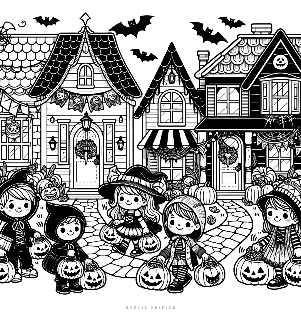Tauch ein in die charmante Welt des Trick-or-Treat mit dieser Ausmalseite! Diese entzückende Szene zeigt eine Gruppe von Kindern in Kostümen, die bereit sind, vor dem Hintergrund von geschmückten Häusern und umherflatternden Fledermäusen Süßigkeiten zu sammeln.