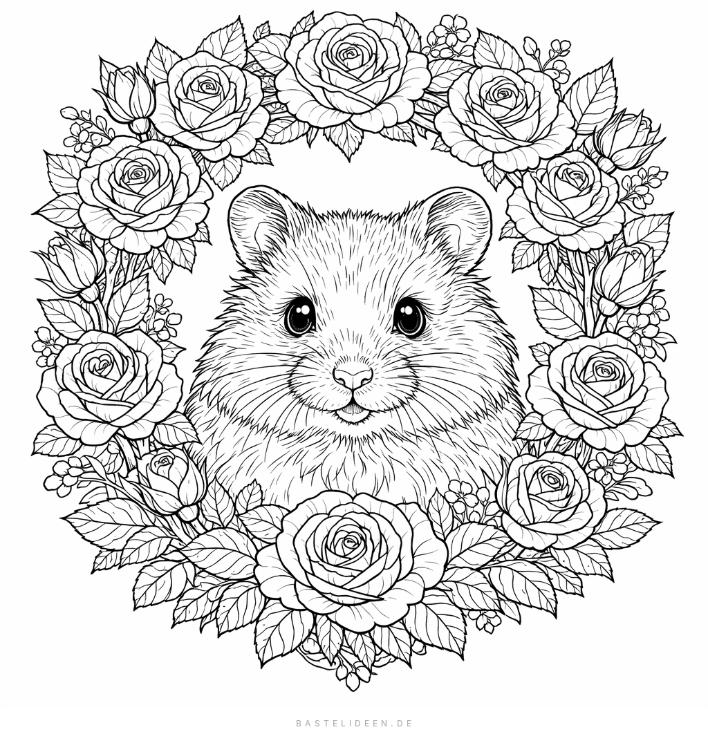 Ein süßes Hamsterportrait, eingerahmt von einem prächtigen Kranz aus detailreichen Rosen und Blättern. Romantisch und kunstvoll.