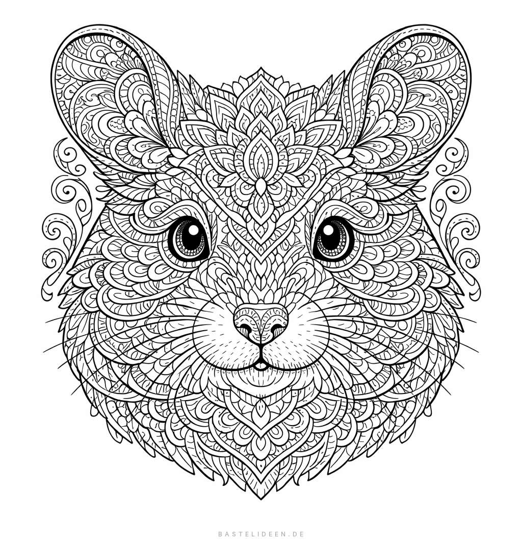 Ein kunstvoll gestalteter Hamsterkopf, gefüllt mit filigranen Mandala-Mustern und dekorativen Schnörkeln. Entspannend und meditativ.