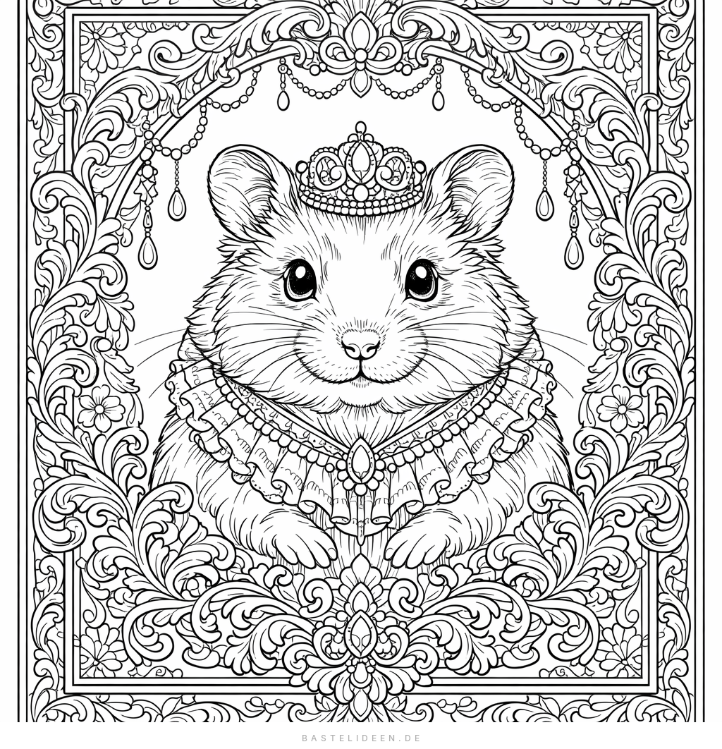 Ein elegantes Hamsterportrait umgeben von viktorianischen Ornamenten und filigranen Verzierungen. Anspruchsvoll und dekorativ.