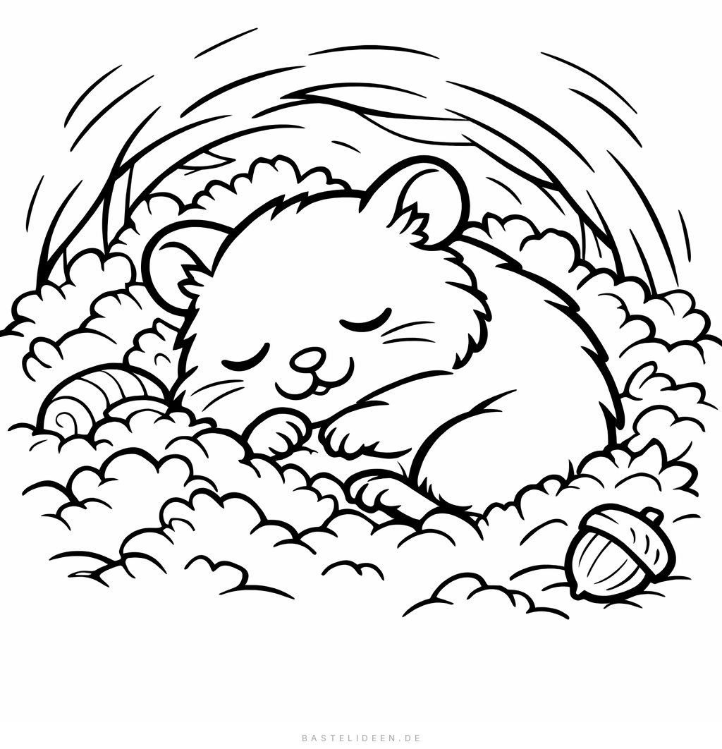 Ein müder Hamster hat sich in sein kuscheliges Nest eingekuschelt und träumt süß. Friedlich und gemütlich zum Ausmalen.