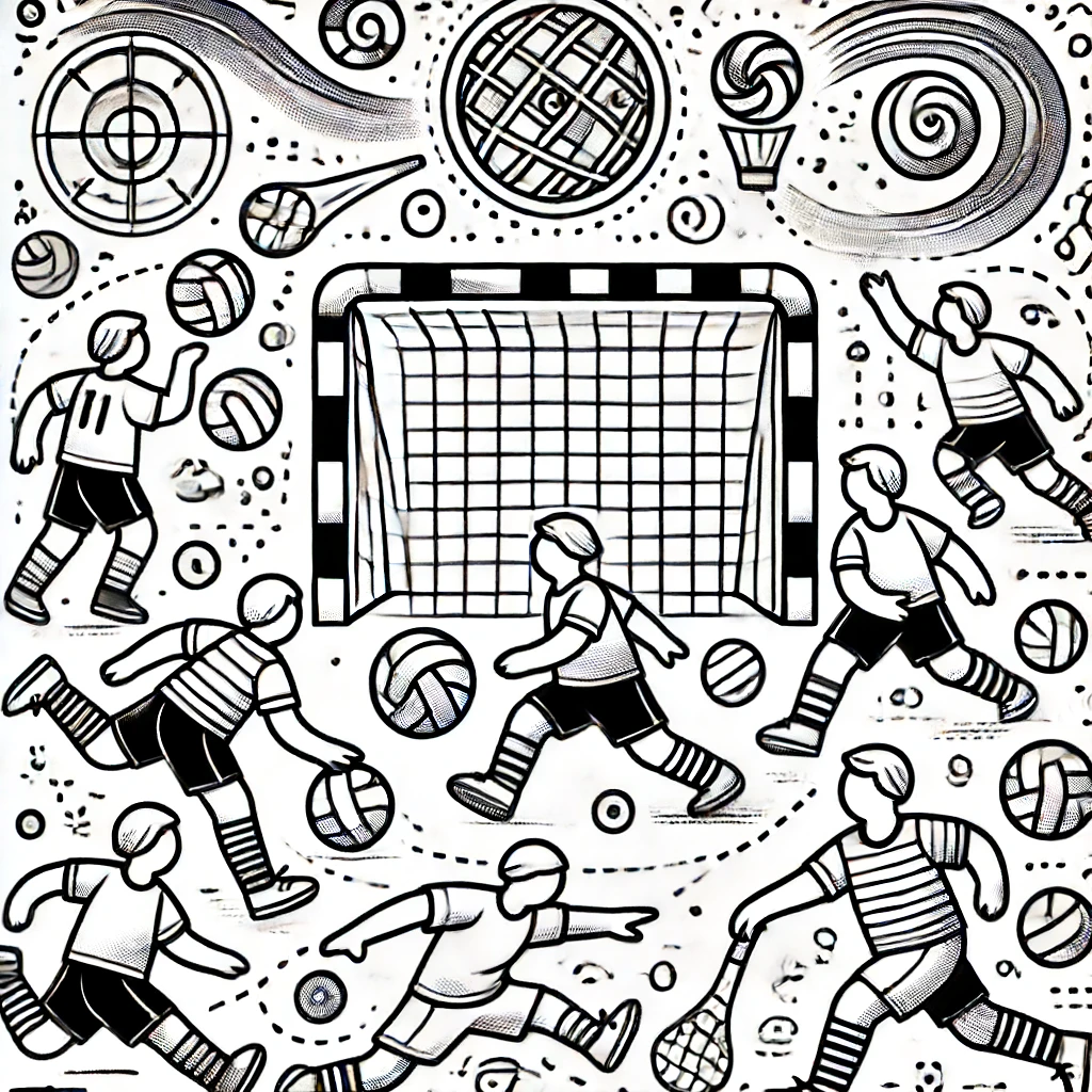 Das beigefügte Bild fängt den Nervenkitzel eines Handballspiels ein, perfekt für Sportfans zum Ausmalen. Es zeigt Spieler, die aktiv am Spiel beteiligt sind, mit dynamischen Posen und einem Torwart, der bereit ist, das Tor zu verteidigen.