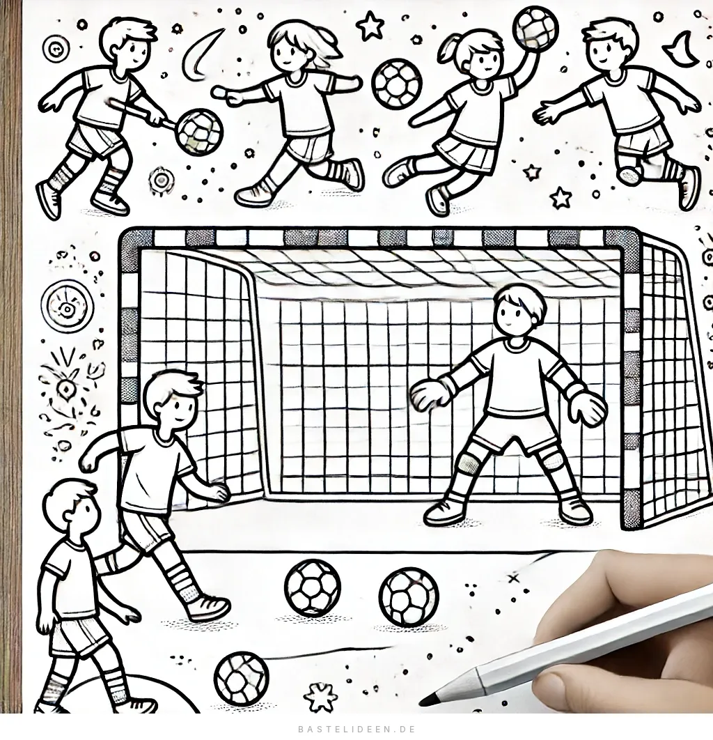 Das beigefügte Bild zeigt eine lebhafte Handballspielszene, perfekt für junge Sportbegeisterte zum Ausmalen. Die Illustration zeigt vier Spieler, die sich energisch in einem Spiel engagieren, wobei ein Spieler eine dramatische Parade am Tor macht.
