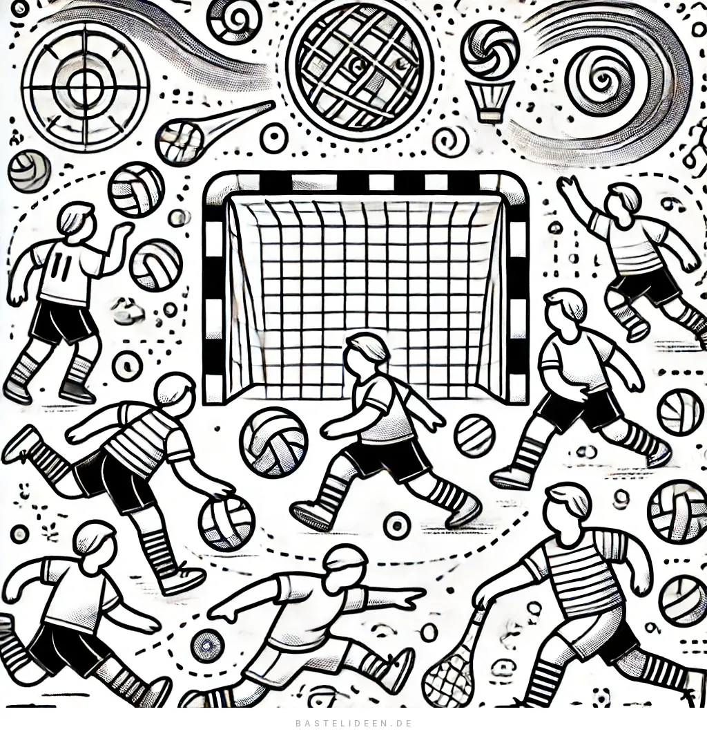 Das beigefügte Bild fängt den Nervenkitzel eines Handballspiels ein, perfekt für Sportfans zum Ausmalen. Es zeigt Spieler, die aktiv am Spiel beteiligt sind, mit dynamischen Posen und einem Torwart, der bereit ist, das Tor zu verteidigen.
