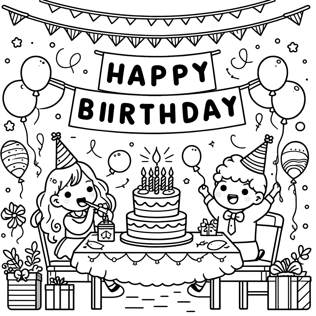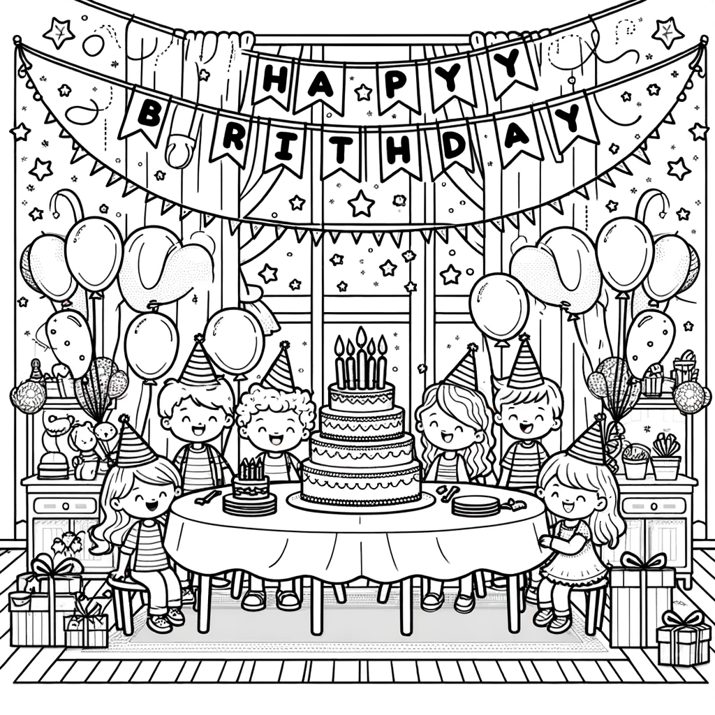 Diese entzückende Schwarz-Weiss-Illustration zeigt eine fröhliche Geburtstagsfeier mit Kindern, die Partyhüte tragen und von Ballons und Geschenken umgeben sind. Im Mittelpunkt der Feier steht eine große, wunderschön dekorierte Geburtstagstorte mit Kerzen.