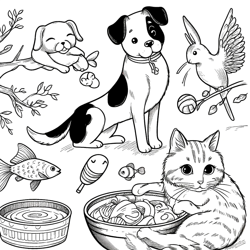 Dieses bezaubernde Ausmalbild zeigt eine Vielzahl von niedlichen Haustieren, darunter einen verspielten Hund, eine neugierige Katze, einen schlafenden Welpen, einen zwitschernden Vogel und zwei lebhafte Fische in einer Schale.