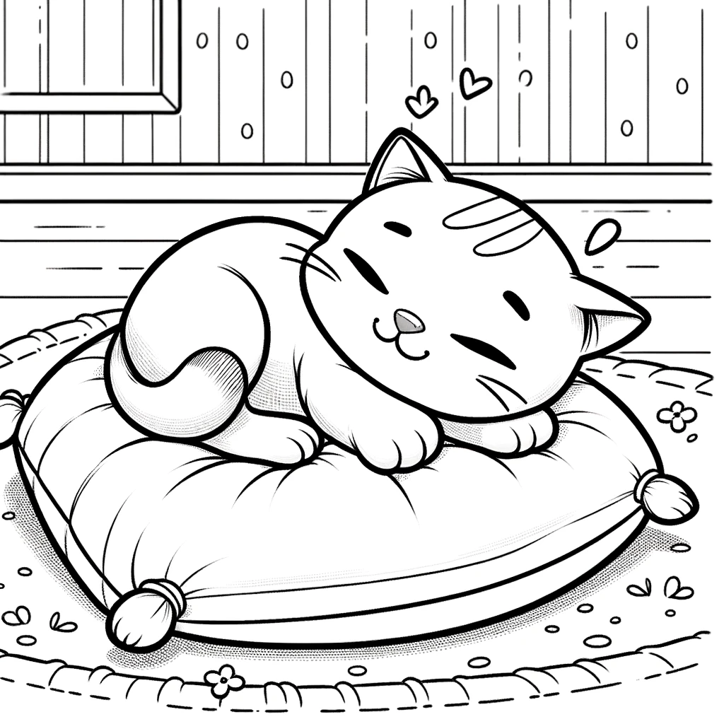 Dieses entzückende Ausmalbild zeigt ein niedliches Kätzchen, das friedlich auf einem gemütlichen Kissen schläft. Die ruhige Szenerie mit kleinen Herzen fängt einen Moment der reinen Ruhe ein.