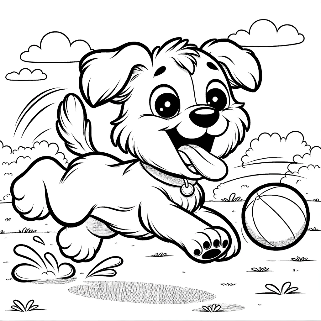 Dieses entzückende Ausmalbild zeigt einen verspielten Welpen, der fröhlich einem Ball im Park hinterherläuft. Der glückliche Gesichtsausdruck und der wedelnde Schwanz fangen das Gefühl eines unbeschwerten Tages im Freien ein.