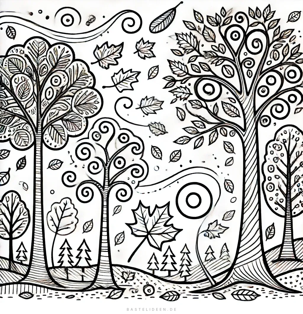 Das beigefügte Bild zeigt eine verspielte Waldszene, die mit einer Vielzahl von Bäumen gefüllt ist, die jeweils mit komplizierten Mustern und wirbelnden Zweigen verziert sind. Das spielerische Design der durch die Luft schwebenden Blätter verleiht der Illustration Dynamik.