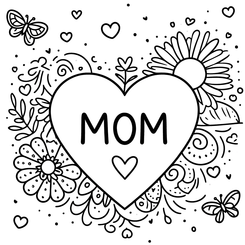 Diese entzückende Malvorlage zeigt ein Herz mit dem Schriftzug Mama in der Mitte, umgeben von einer schönen Anordnung aus Blumen, Blättern, Schmetterlingen und Herzen. Das detailreiche Design lädt dich ein, lebendige Farben hinzuzufuegen.