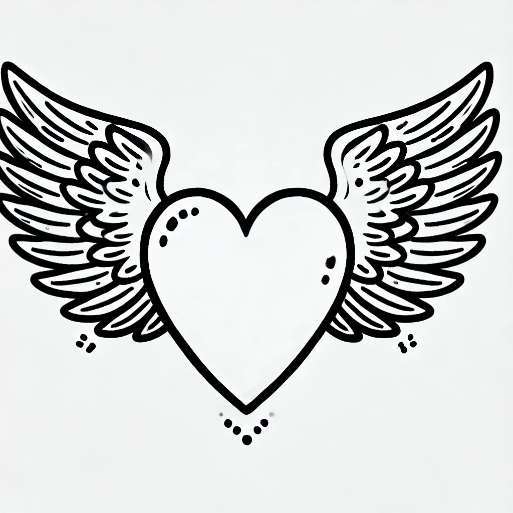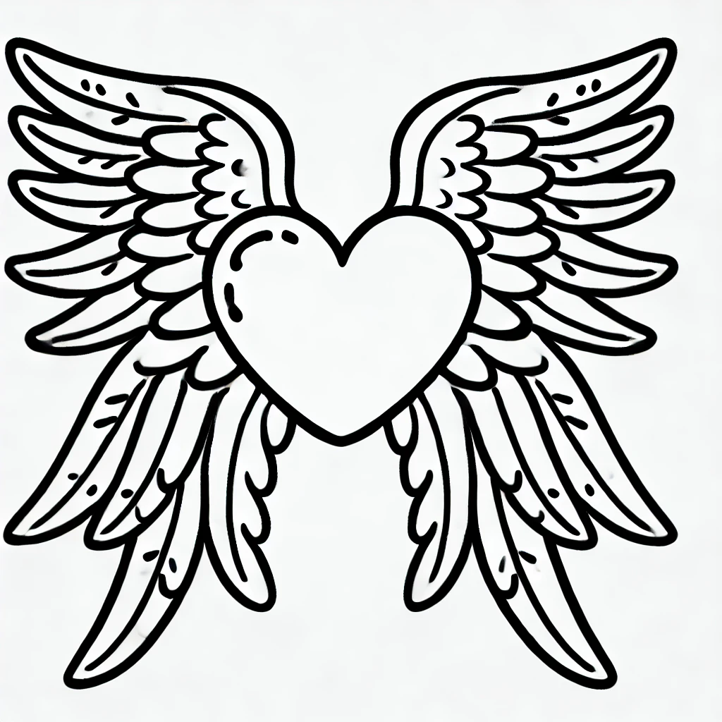 Dieses Ausmalbild zeigt ein auffaelliges und elegantes Design mit einem großen Herz und wunderschön detaillierten Flügeln. Die Flügel sind weit und fliessend und verleihen dem Bild ein Gefühl von Freiheit und Anmut.