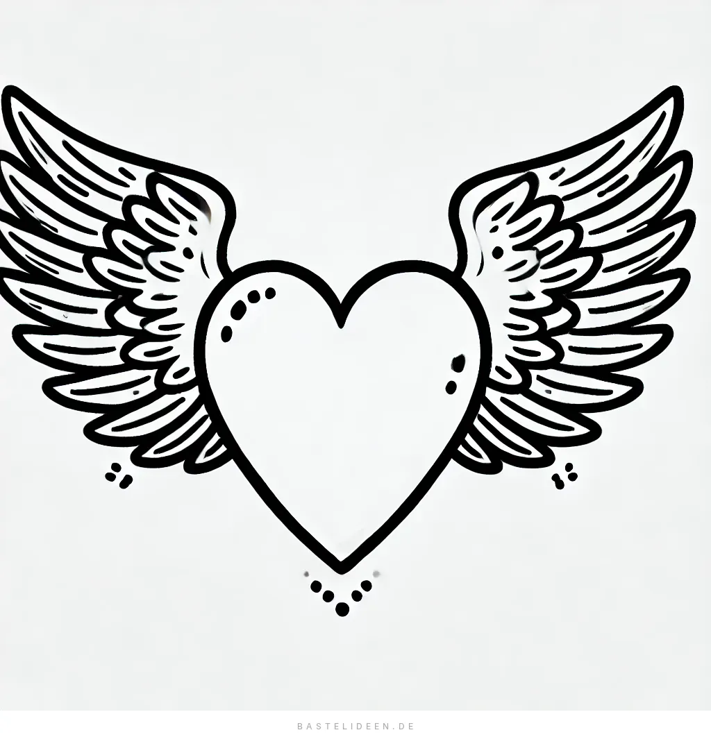 Dieses Ausmalbild zeigt ein auffälliges und elegantes Design mit einem großen Herz und wunderschön detaillierten Flügeln. Die Flügel sind weit und fliessend und verleihen dem Bild ein Gefühl von Freiheit und Anmut.