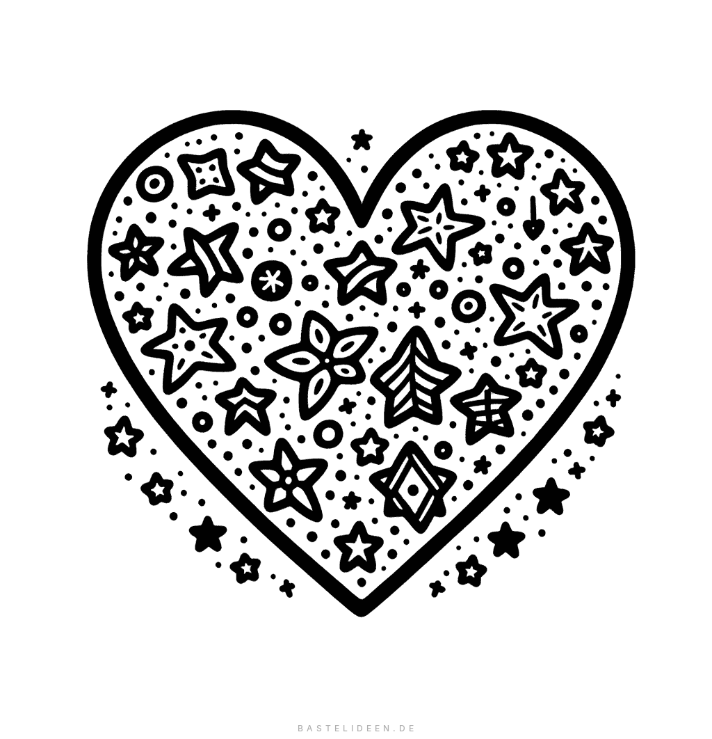 Ein bezauberndes Herz-Motiv gefüllt mit funkelnden Sternen und floralen Mustern - ideal zum kreativen Ausmalen.