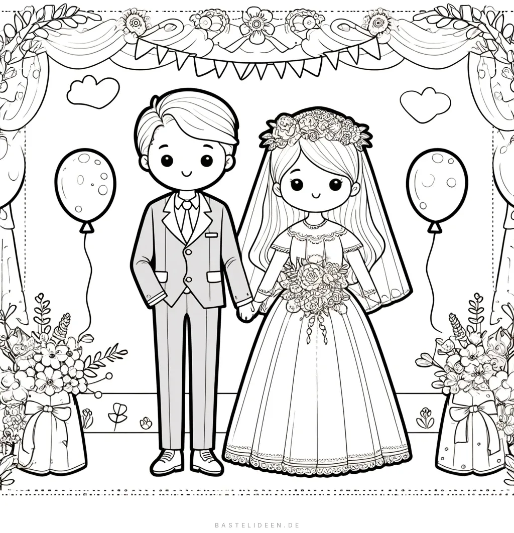 Diese entzückende Ausmalvorlage zeigt ein süsses Cartoon-Paar, das bei seiner Hochzeitszeremonie zusammen steht. Die Braut, in ihrem wunderschönen Kleid mit detaillierter Spitze, hält einen Blumenstrauss, während der Bräutigam in einem schicken Anzug neben ihr steht.