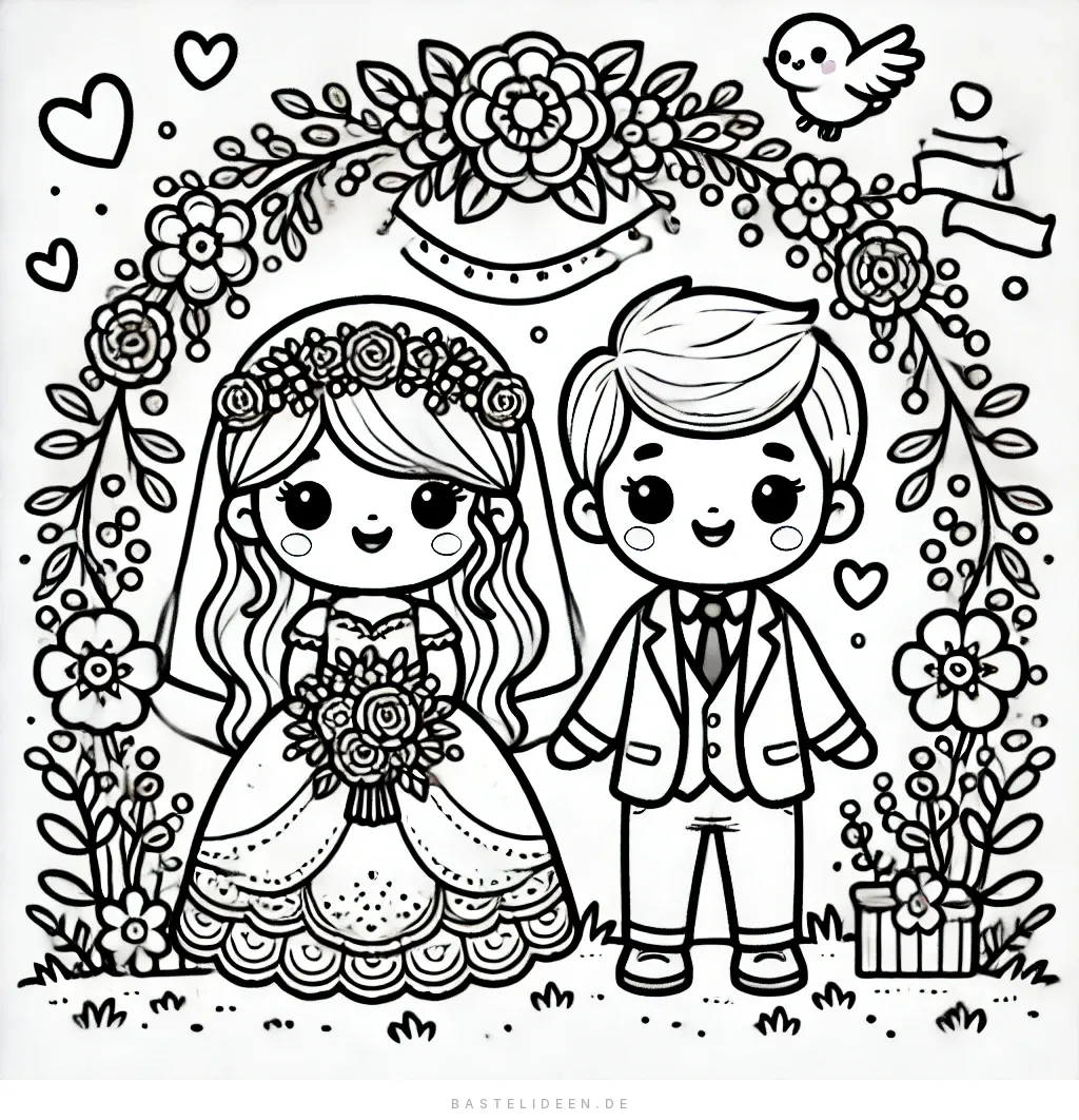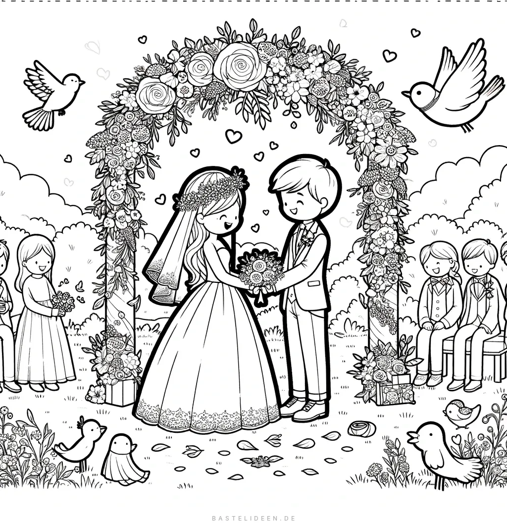 Bezauberndes Hochzeits-Ausmalbild mit Blumenbogen