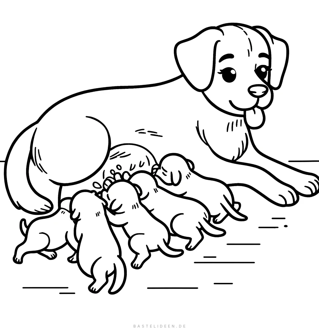 Dieses herzerwarmende Ausmalbild zeigt eine Hundemutter, die liebevoll ihre vier Welpen säugt. Die zärtliche Szene fängt die Bindung zwischen der Mutter und ihren verspielten Welpen ein und schafft ein rührendes und friedliches Bild.