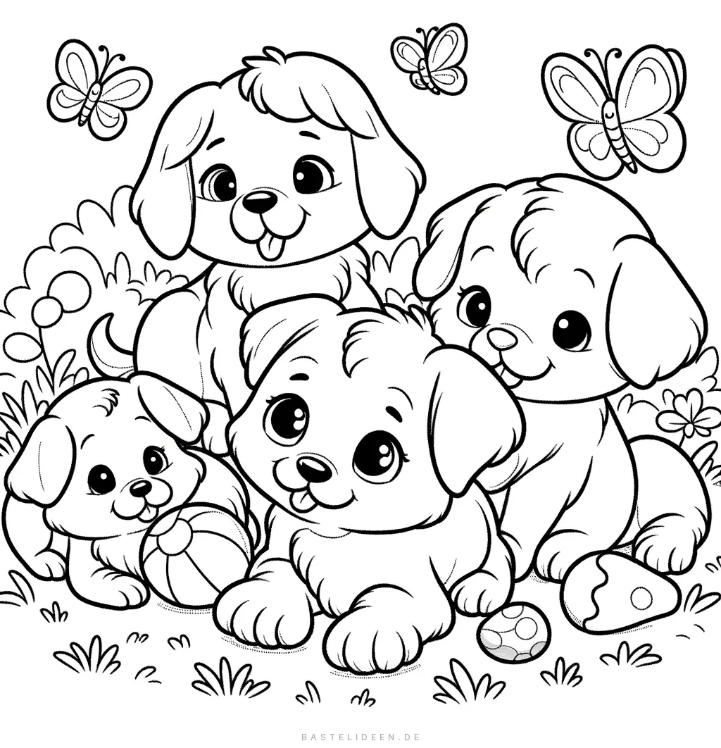 Dieses entzückende Ausmalbild zeigt vier niedliche Welpen, die in einem Garten spielen, umgeben von Schmetterlingen und Blumen. Jeder Welpe hat einen fröhlichen Gesichtsausdruck, was die Szene herzerwarmend und spassig zum Ausmalen macht.