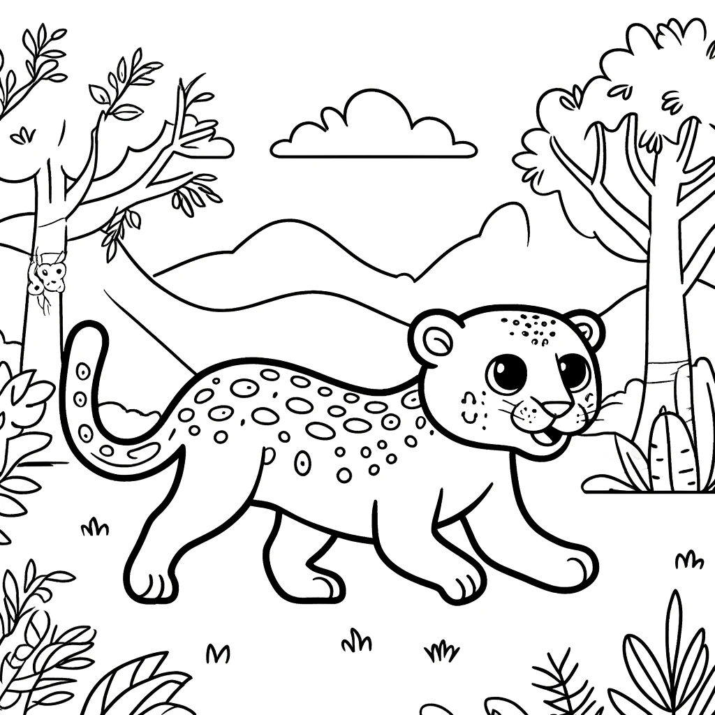Diese entzückende Malvorlage zeigt einen verspielten Jaguar, der seine Dschungelumgebung erkundet, umgeben von üppigen Bäumen und sanften Hügeln. Der neugierige Ausdruck und die dynamische Pose des Jaguars bringen ein Gefühl von Abenteuer in die Szene.