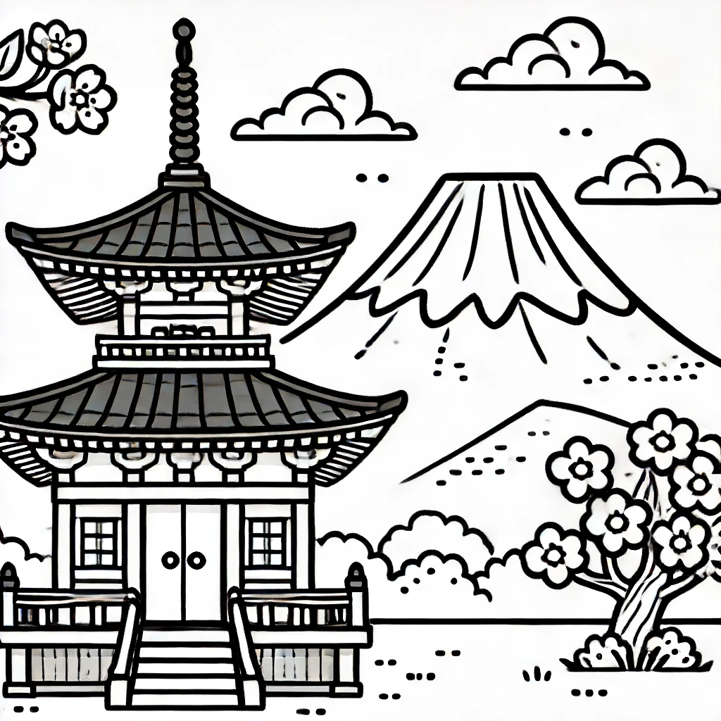 Dieses atemberaubende Ausmalbild zeigt einen traditionellen japanischen Tempel vor der majestätischen Kulisse des Berges Fuji. Die friedliche Szene wird durch blühende Kirschblueten abgerundet.