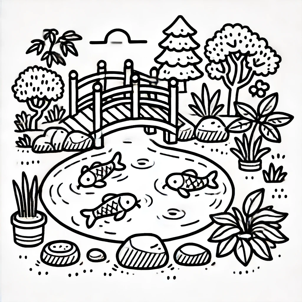 Dieses wunderbare Ausmalbild zeigt einen ruhigen japanischen Garten mit einer charmanten Bogenbruecke über einem Koi-Teich, umgeben von üppigen Bäumen und Pflanzen.