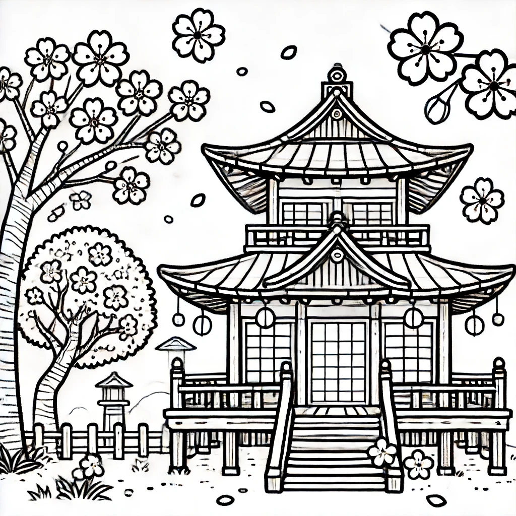 Dieses wunderschöne Ausmalbild zeigt einen ruhigen japanischen Tempel, umgeben von Kirschbluetenbäumen in voller Blüte mit zarten fallenden Blütenblaettern.