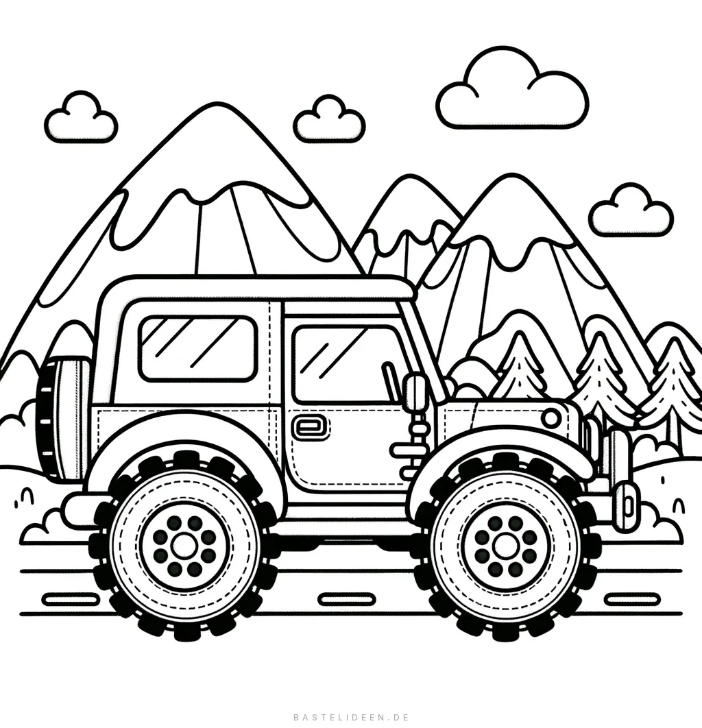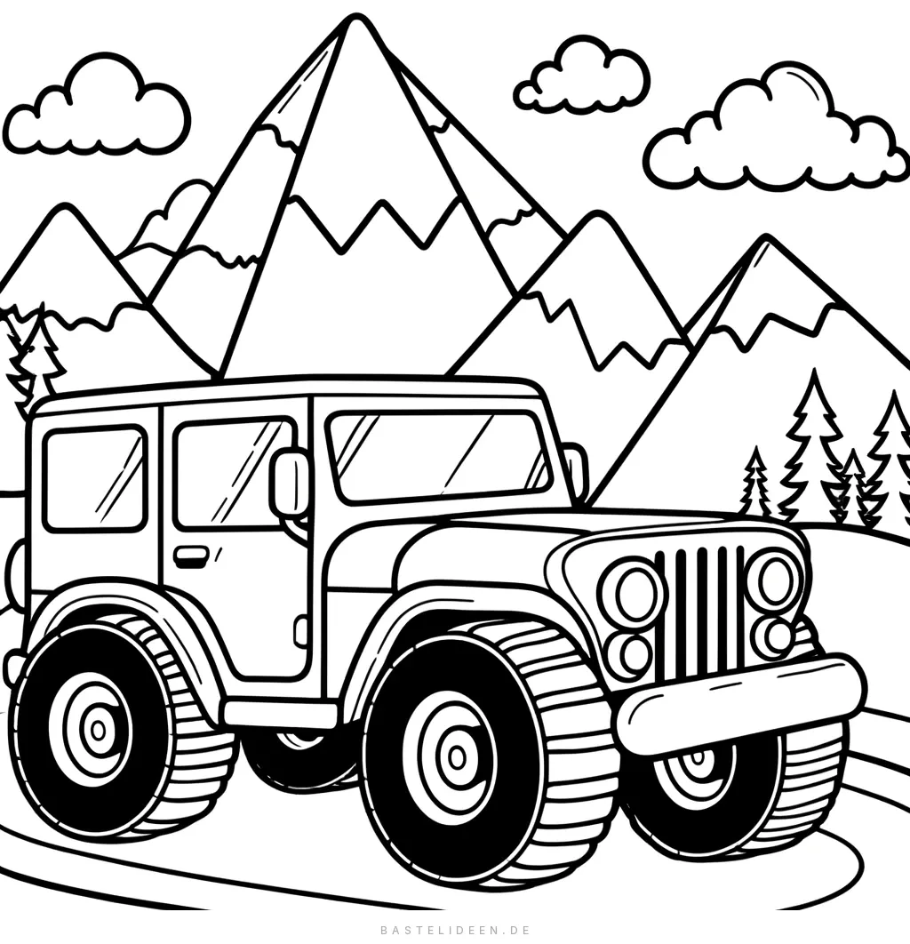Diese detaillierte Malvorlage zeigt einen robusten Offroad-Jeep mit großen Geländereifen vor einer Kulisse aus hohen Bergen und dichten Kiefernwäldern.