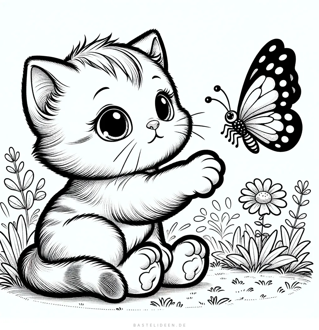 Dieses bezaubernde Bild zeigt ein verspieltes Kätzchen, das nach einem Schmetterling greift - ein Moment voller Neugier und Freude. Vor einer natürlichen Kulisse mit Blumen ist es perfekt für alle, die Tiere und die Natur gerne ausmalen.