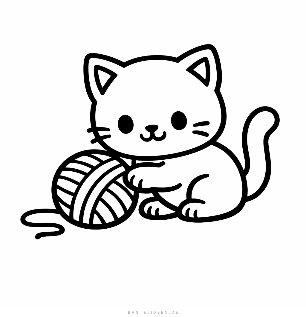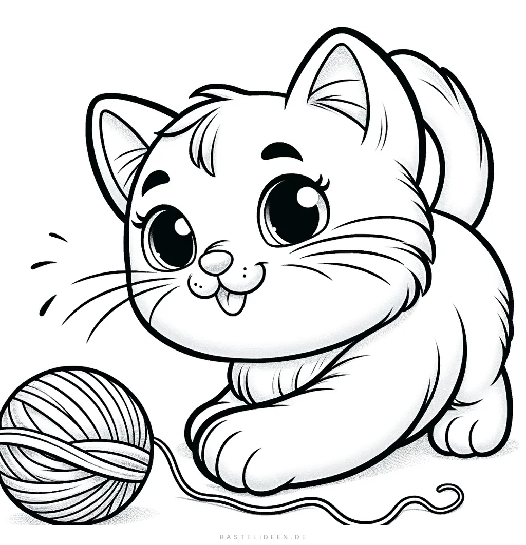 Dieses niedliche Kätzchen ist bereit, mit einem Wollknäuel zu spielen - perfekt für eine entspannende Ausmalaktion! Mit seinen großen, ausdrucksstarken Augen und seiner verspielten Haltung fängt dieses Bild die unschuldige Verspieltheit eines Kätzchens wunderbar ein.