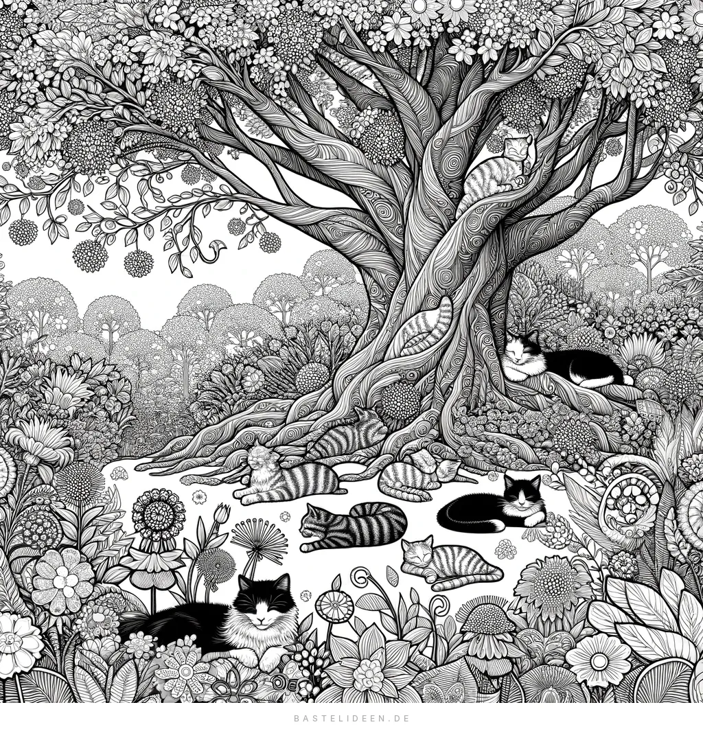 Tauche ein in eine ruhige und bezaubernde Welt mit unserer neuesten Katzen-Malvorlage für Erwachsene. Dieses wunderschön detaillierte Design zeigt eine Gruppe von Katzen, die unter einem majestätischen Baum liegen, umgeben von filigranen Blumen- und Waldmustern.