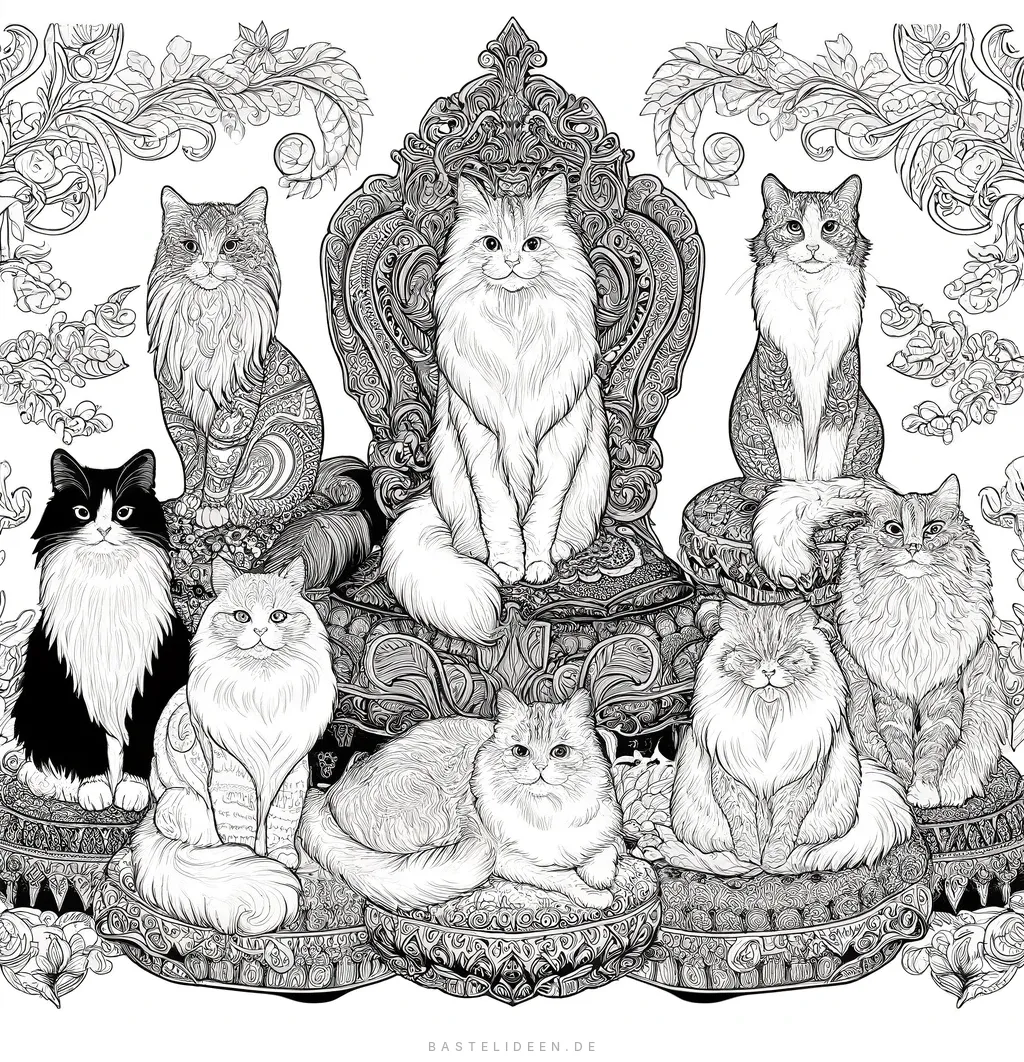 Tauche ein in die Welt des Ausmalens für Erwachsene mit unserer fesselnden Katzen-Malvorlage. Dieses aufwendige Design zeigt eine königliche Versammlung von Katzen, jede auf kunstvollen Kissen sitzend und umgeben von elaborierten Mustern.