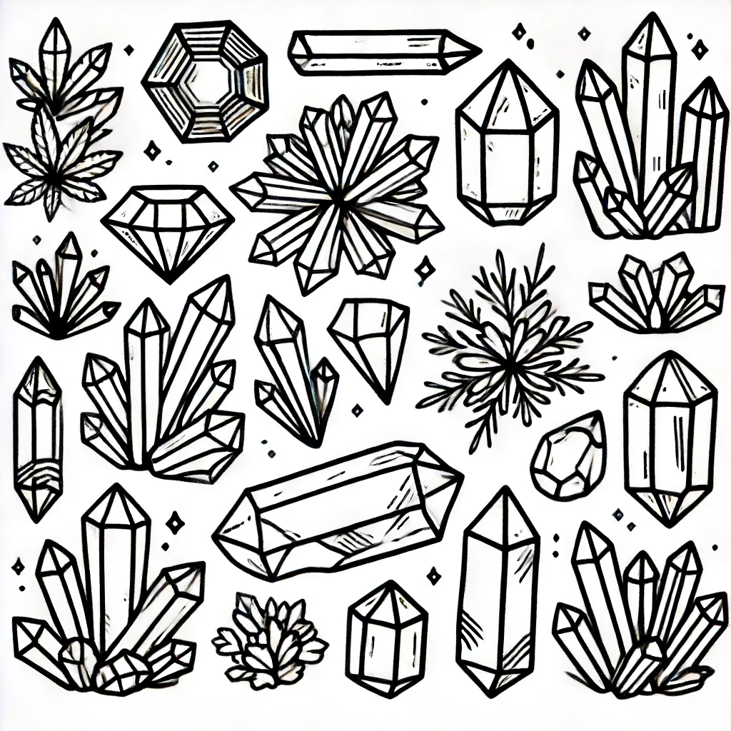 Das beigefügte Bild zeigt eine atemberaubende Sammlung von verschiedenen Kristallformen und -formationen, perfekt für eine fesselnde Malaktivitaet. Die detaillierten Designs zeigen die Schönheit der Kristalle, von scharfen geometrischen Formen bis hin zu zarten, filigranen Clustern.