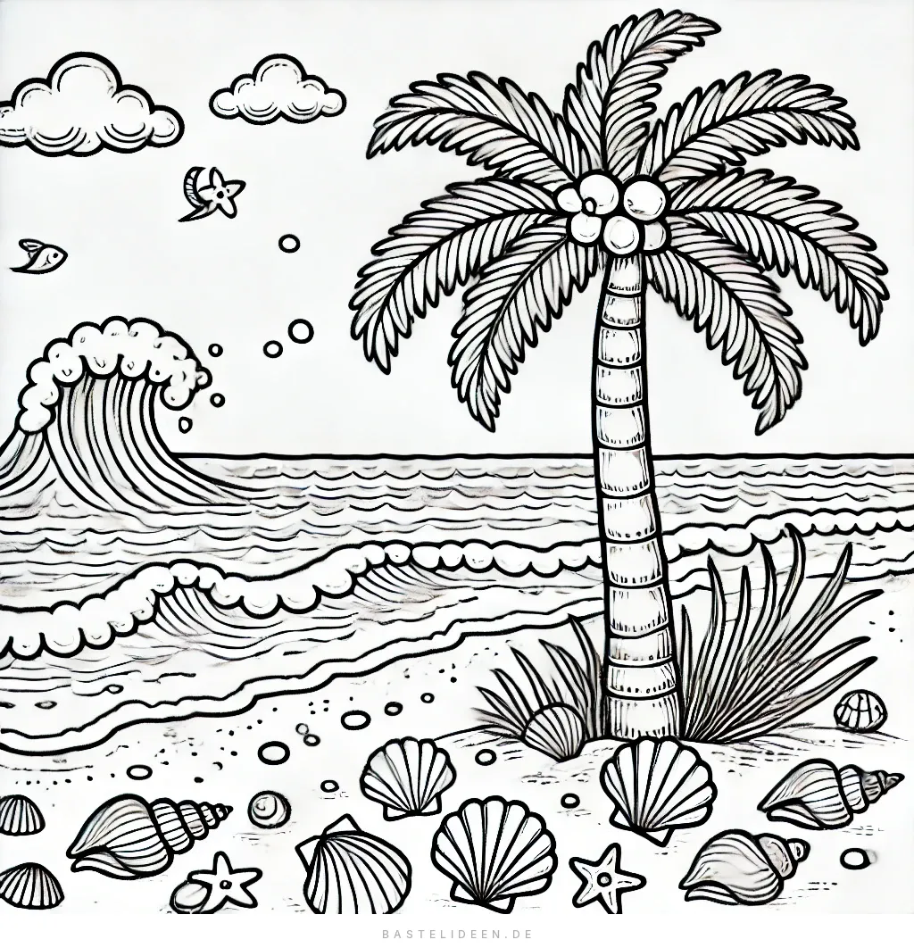 Dieses entzückende Ausmalbild fängt die Essenz einer ruhigen Strandlandschaft ein, komplett mit einer hohen Palme, sanften Wellen und verstreuten Muscheln. Das Bild zeigt auch spielerische Elemente wie einen Seestern, Fische und Vögel.