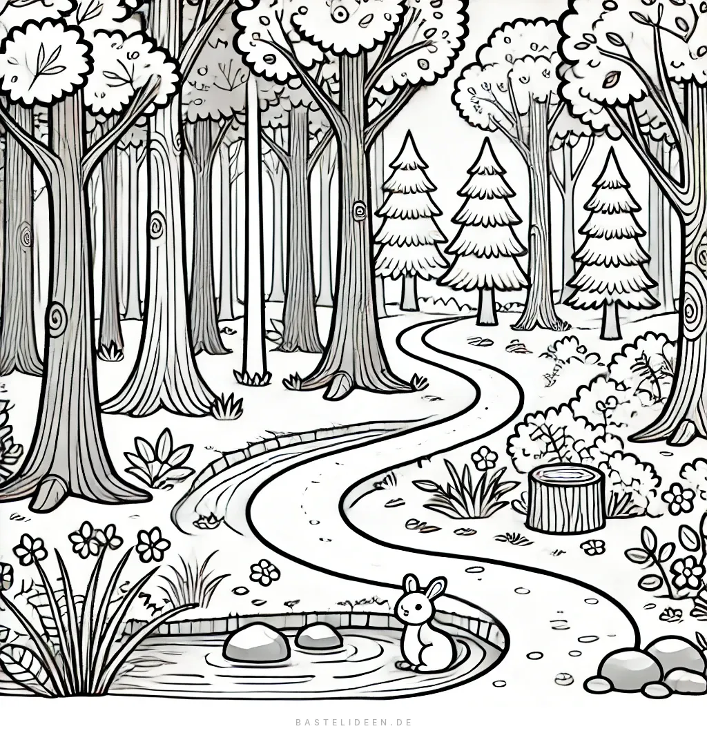Dieses bezaubernde Ausmalbild zeigt eine verwunschene Waldszene mit einem sich windenden Pfad, der dich zum Erkunden einlädt. Hohe Bäume mit detaillierten Stämmen und üppigem Laub schaffen eine ruhige und magische Atmosphäre. Ein kleines Häschen an einem friedlichen Teich verleiht der Szene Charme.