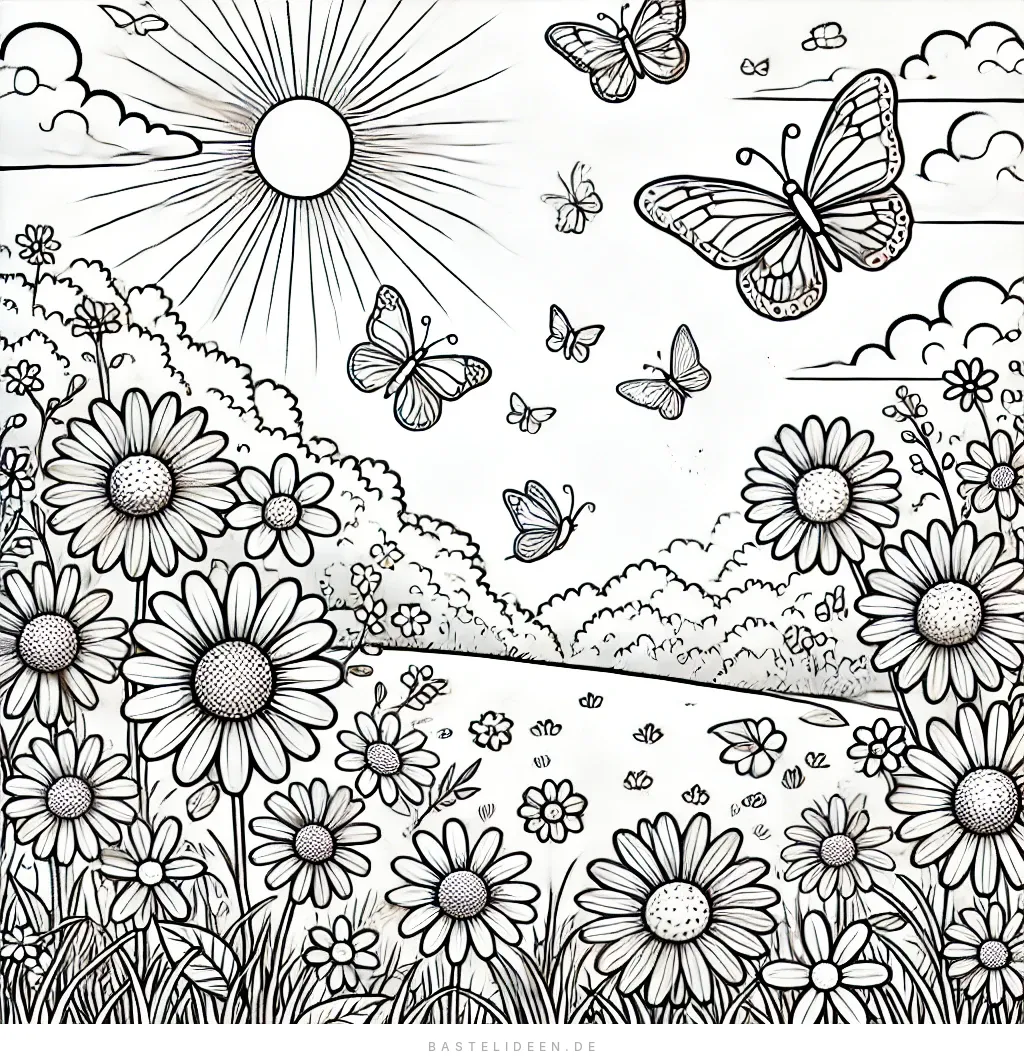 Dieses entzückende Ausmalbild fängt die Schönheit einer sonnigen Wiese ein, die mit blühenden Blumen und flatternden Schmetterlingen gefüllt ist. Die strahlende Sonne scheint über die Landschaft und schafft eine warme und einladende Atmosphäre.